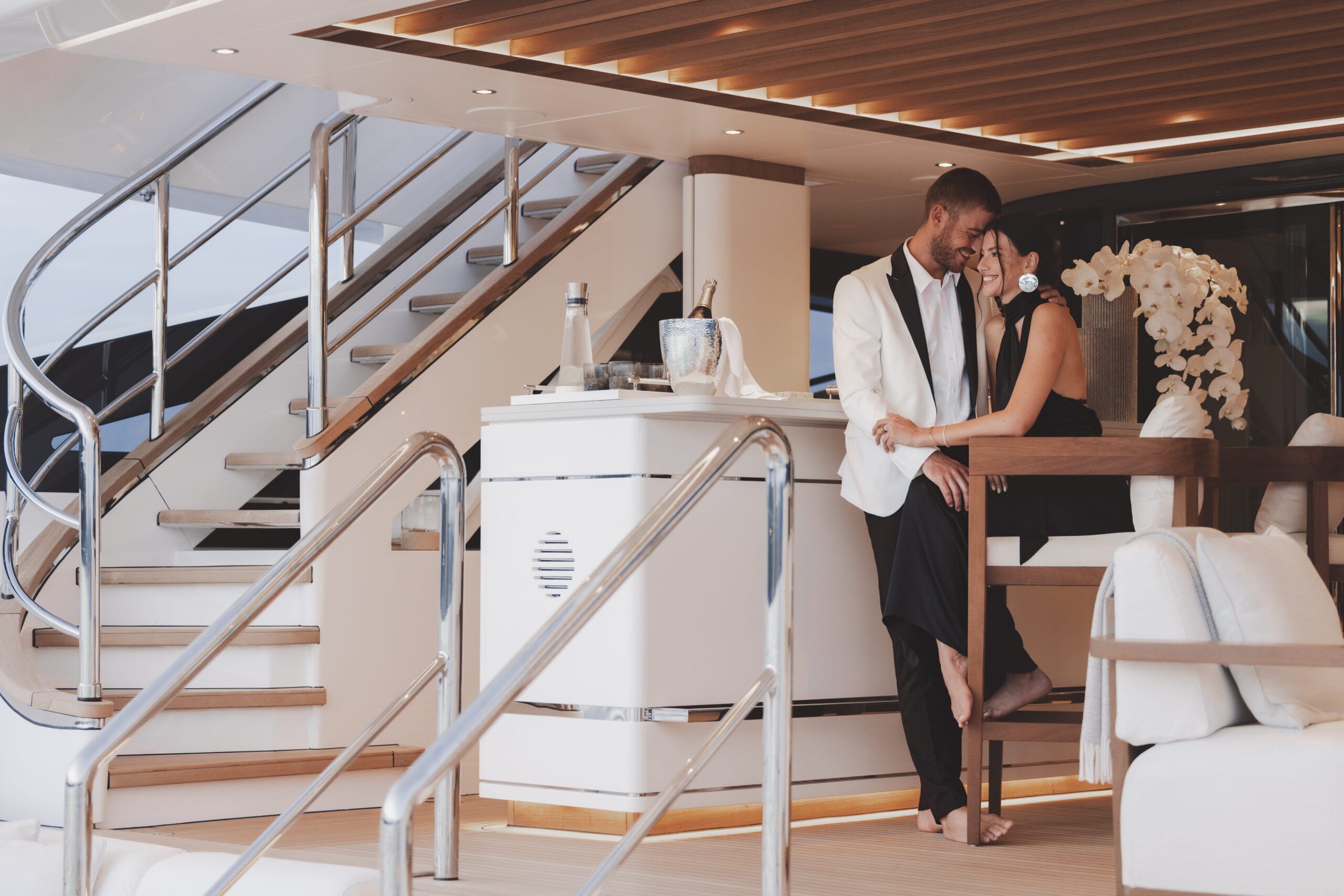 It can take multiple charters for guests to fully determine their likes and dislikes. For those looking for social spaces that “flow naturally from one area to another,” KOGO is a great match, says broker Clara Lormant, with “a sundeck pool that becomes the hub during the day, and an upper deck aft that transforms into an outdoor cinema.” Likewise, Guy recommends ASANI for her design that centers around “open living, wellness, and effortless connection with the sea.” While charter manager Caroline Taylor singles out NAIA’s amenities that are a hit with families. “Complete with a full water sports inventory, a fleet of tenders, and a well-equipped gym with a Jacuzzi, NAIA provides something for everyone on board,” she says.