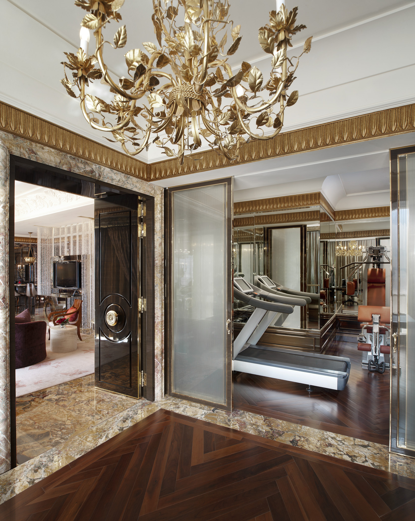Beyond the materials, the suite holds significant art: rare pieces by Marc Chagall, Mark Tobey, Le Pho, and Sam Francis are displayed alongside painted silk artwork panels and Czech crystal chandeliers. Functionality is prioritized across the residence's dedicated spaces. Guests have access to a private fitness room and a study, while the living room includes a grand piano. For entertaining, the dining room is set up to host formal meals for up to 12 people. The experience concludes on the large terrace, which provides a definitive vantage point over the city.
