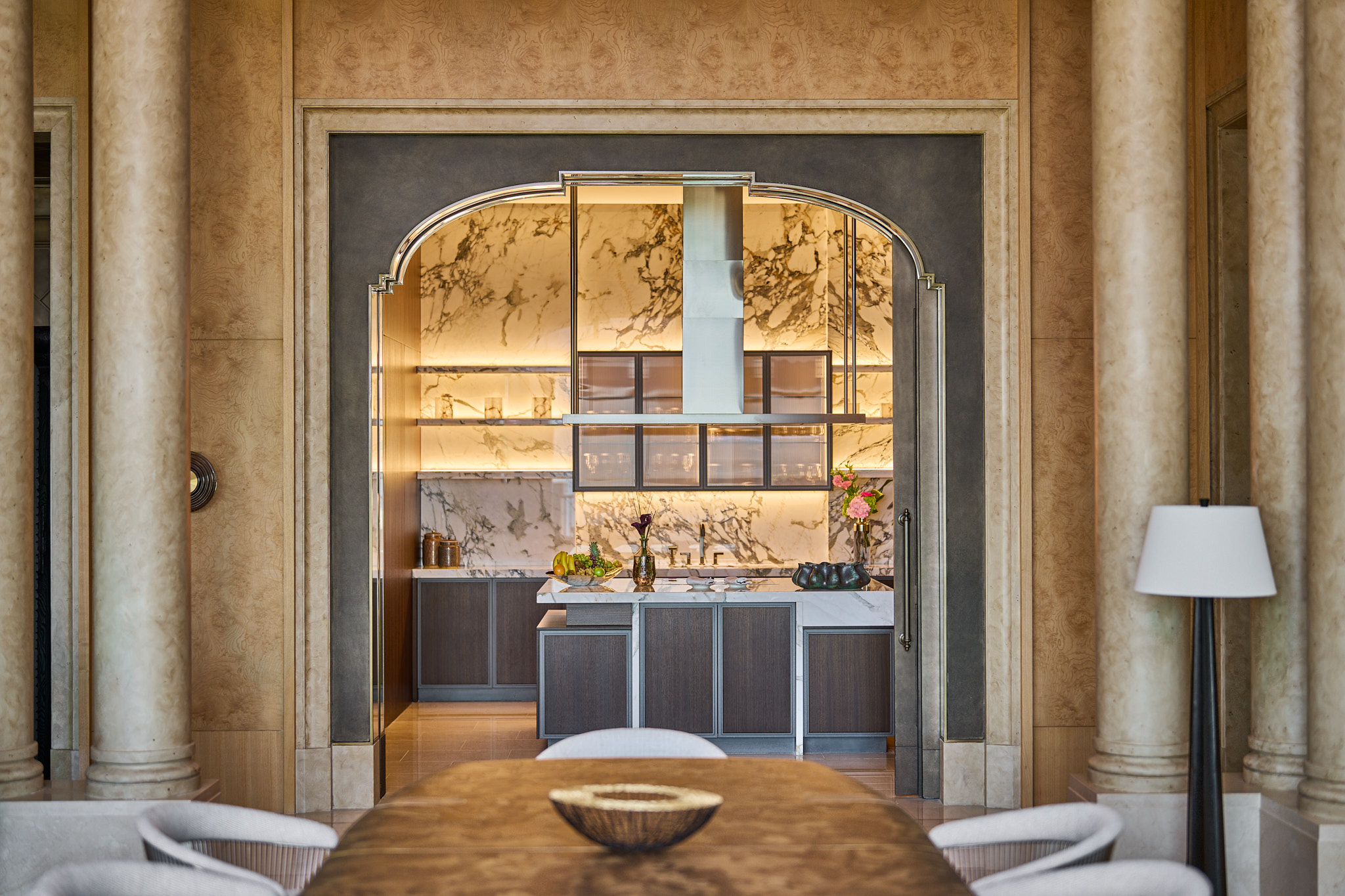 Situated on the fifth floor and accessed via a private elevator, the Royal Suite is the epitome of opulence. Grand in scale and rich in detail, its soaring living room evokes the splendor of a private ballroom — framed by towering columns, bathed in natural light, and crowned with Venetian chandeliers. A baby grand piano adds a final note of glamour, setting the stage for elegant soirées and intimate gatherings alike. When the evening winds down, retreat to the primary suite, where gleaming white marble and gold accents create a serene, light-filled sanctuary. For moments of pure restoration, the private wellness room offers a tranquil escape, perfectly designed for rejuvenating in effortless style.