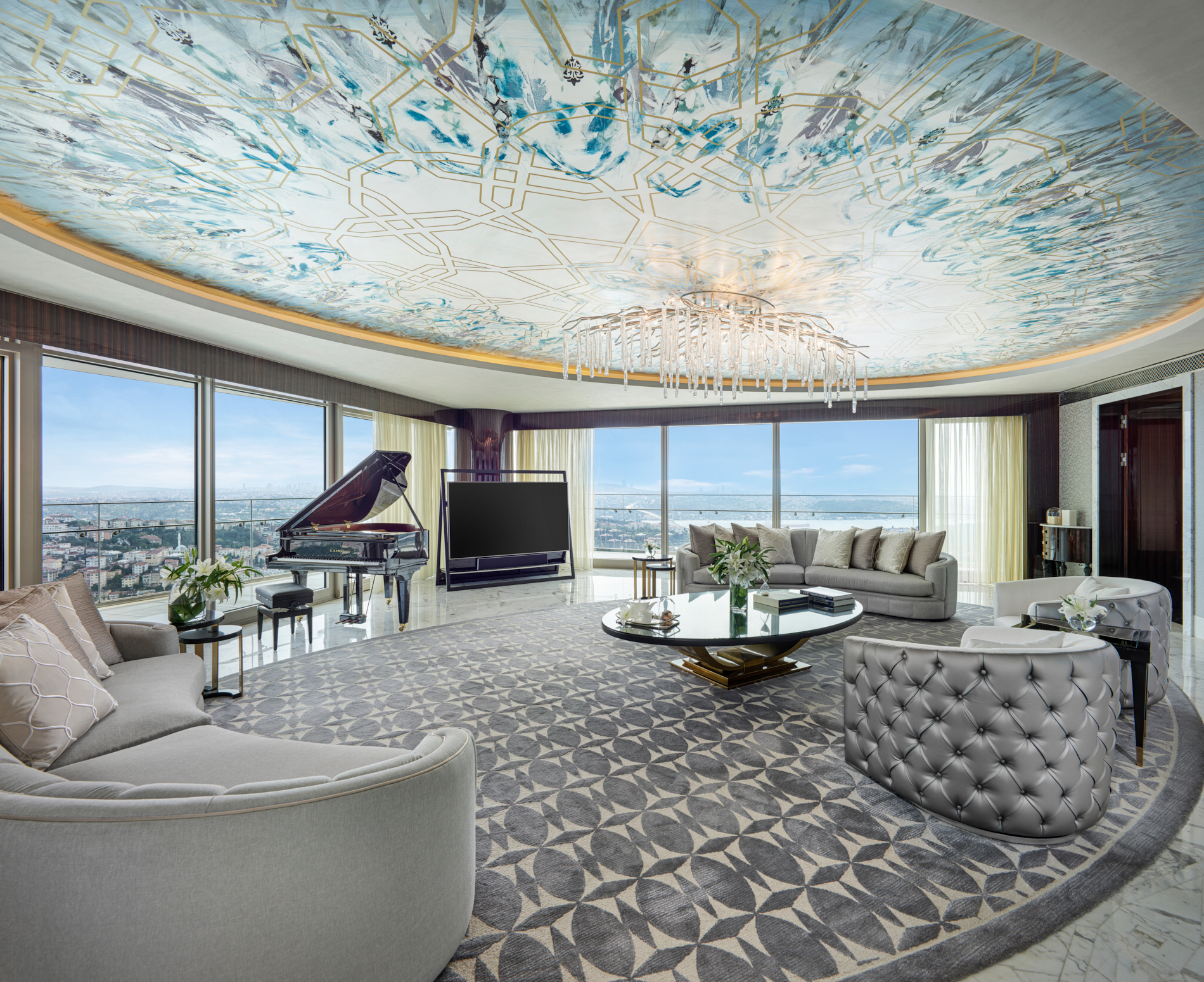 You feel the elevation immediately in the Raffles Suite at Raffles İstanbul. This suite is designed for entertaining, starting with a living room where the seating arrangement encourages discussion, anchored by striking ceiling artwork that highlights the attention to detail here.