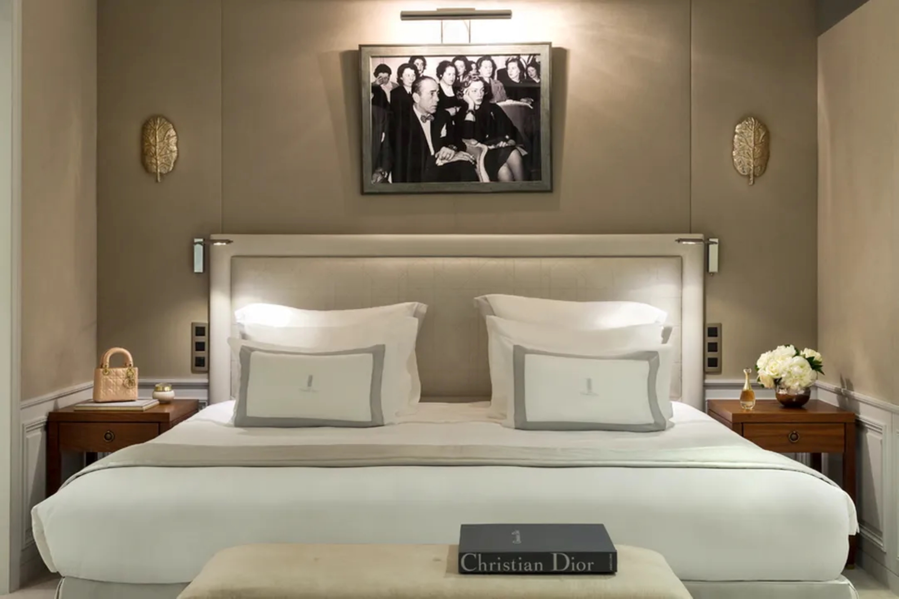 The design of this Haussmann-style apartment pulls directly from an iconic Parisian fashion house, setting a high-style tone right on the Mediterranean coast. Inside, the atmosphere is defined by soft shades of white, cream, and grey, punctuated by details like gilded ceilings, plush velvet furnishings, and striking vintage fashion photography.