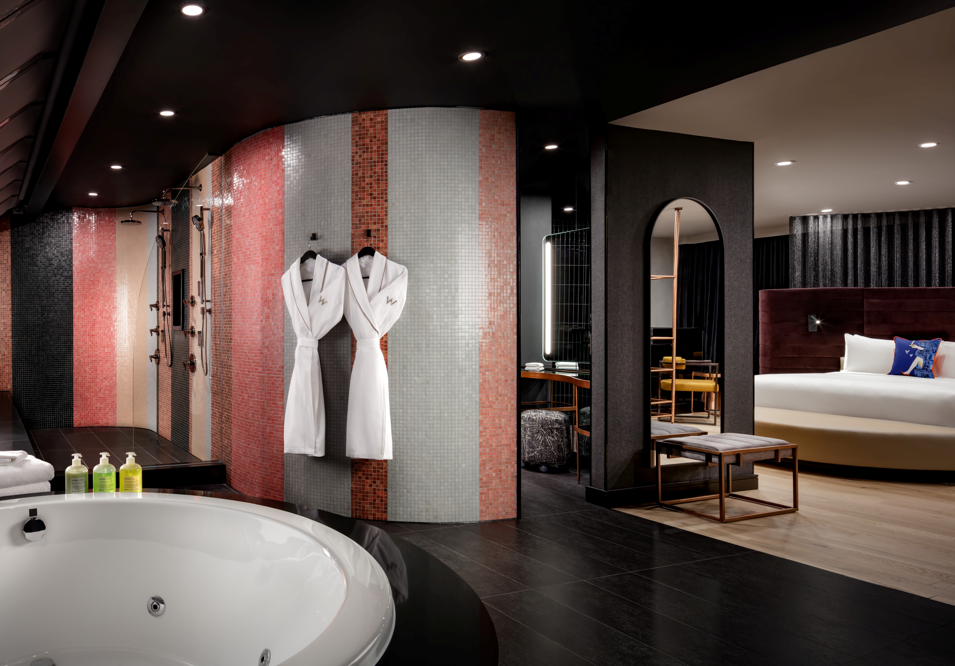 Penthouse 1 is a theatrical expression of contemporary hedonism, wrapped in midnight tones, smoked mirrors, and plush velvet. Spanning two levels with double-height ceilings and expansive windows, the suite unfolds like a stage set: on the main floor, a bold open-plan living space pairs blush velvet and sculptural furnishings with copper detailing and a mirrored bar enclave. A custom banquette runs beneath a wall of gallery-style lighting, while the staircase ascends to the primary bedroom. There, the circular velvet-framed bed is theatrically lit and set beside a sleek dressing area. The bathroom is pure drama: a whirlpool tub, circular rain showers and mosaic-clad walls in gradient tones of blush, brick, and noir.