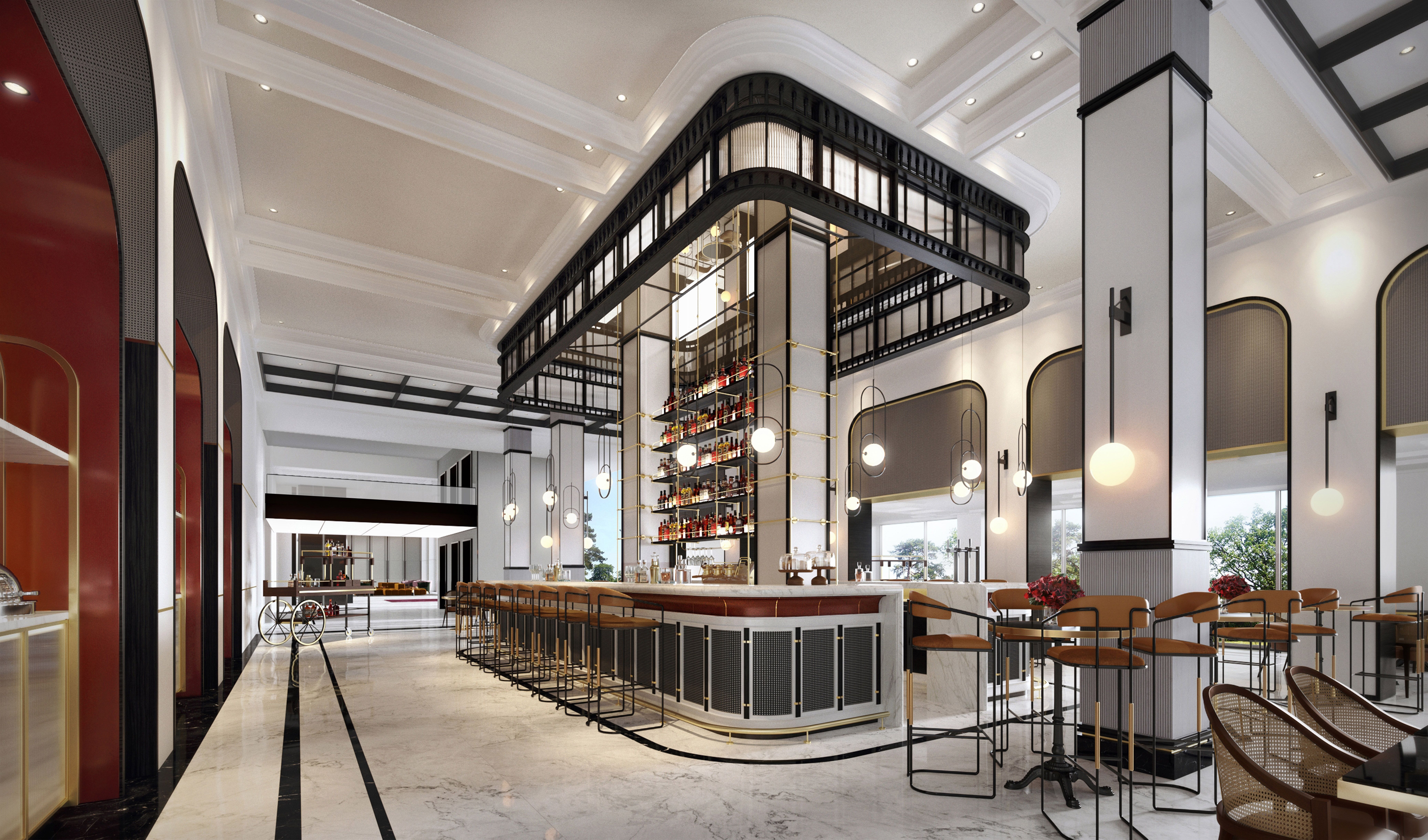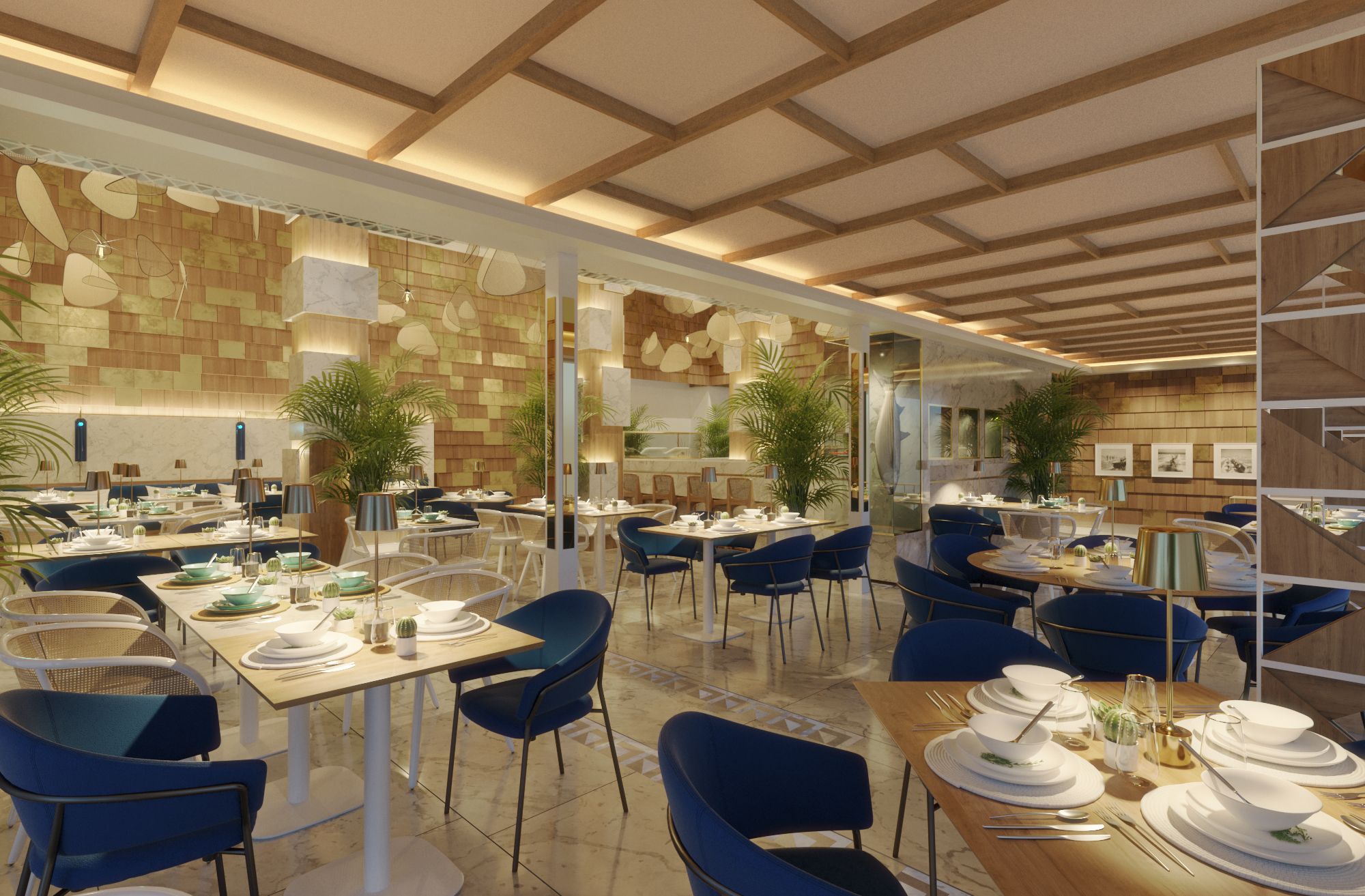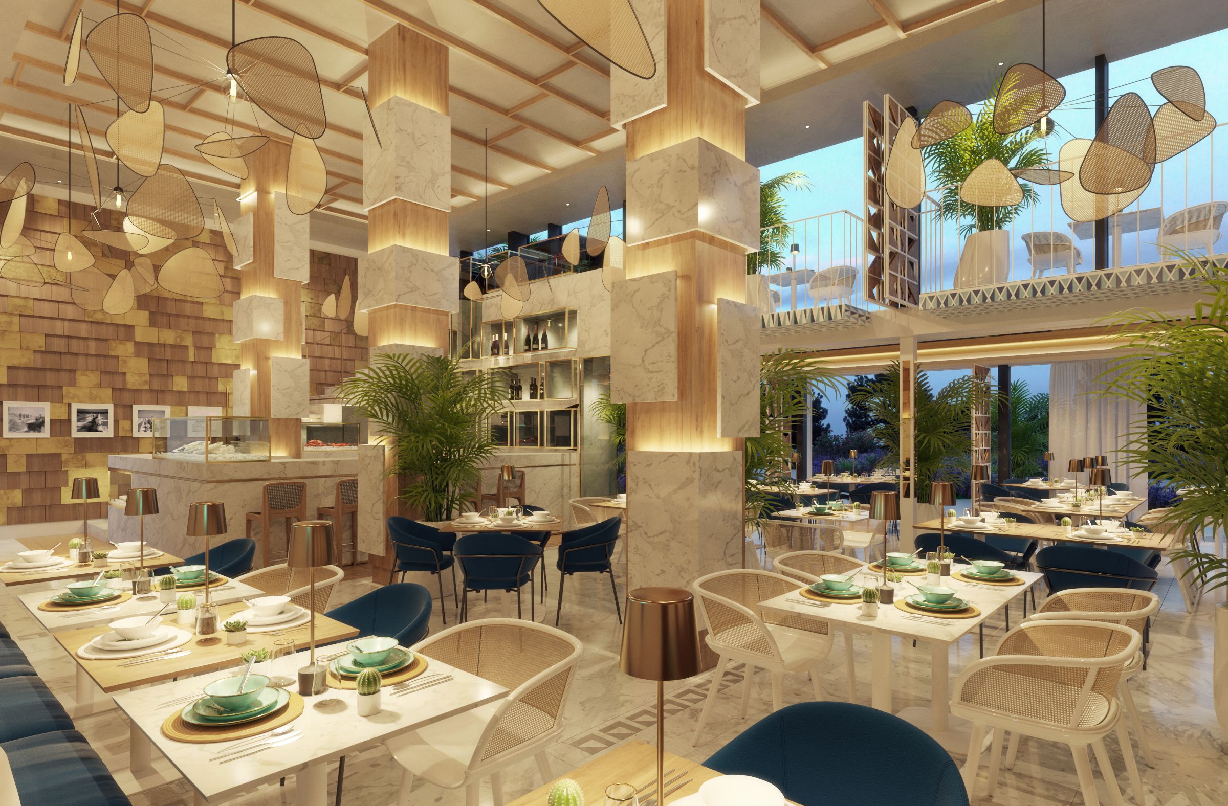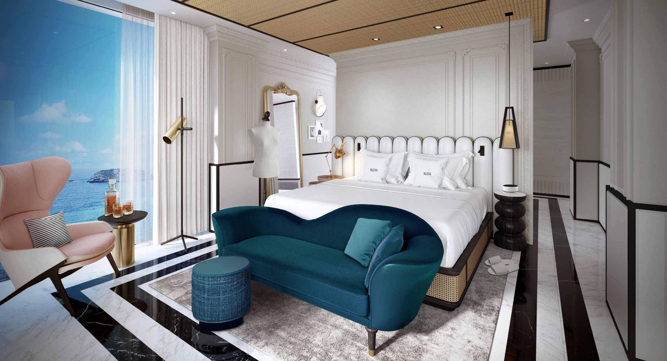 This expansive two-bedroom suite offers guests glass-wrapped luxury, with modern interiors and panoramic ocean views. The suite’s terrace features a round outdoor dining table overlooking the hotel’s pool and surrounding greenery, as well as an outdoor whirlpool tub that provides the perfect spot to take in the island’s natural beauty. Two sun loungers are also positioned for guests to relax and enjoy the sunshine in privacy. Inside, interiors are sleek and stylish, where white marble is paired with black and blue accents. The open-plan living and dining area, furnished with plush pink dining chairs and an oversized velvet sofa, opens onto one of the suite’s two terraces through sliding doors. In the master bedroom, a marble tub is set between the bed and floor-to-ceiling windows, allowing guests to enjoy the views from the comfort of a warm bath. The second en-suite bedroom includes two twin beds, making the suite well-suited to both families and groups of friends.