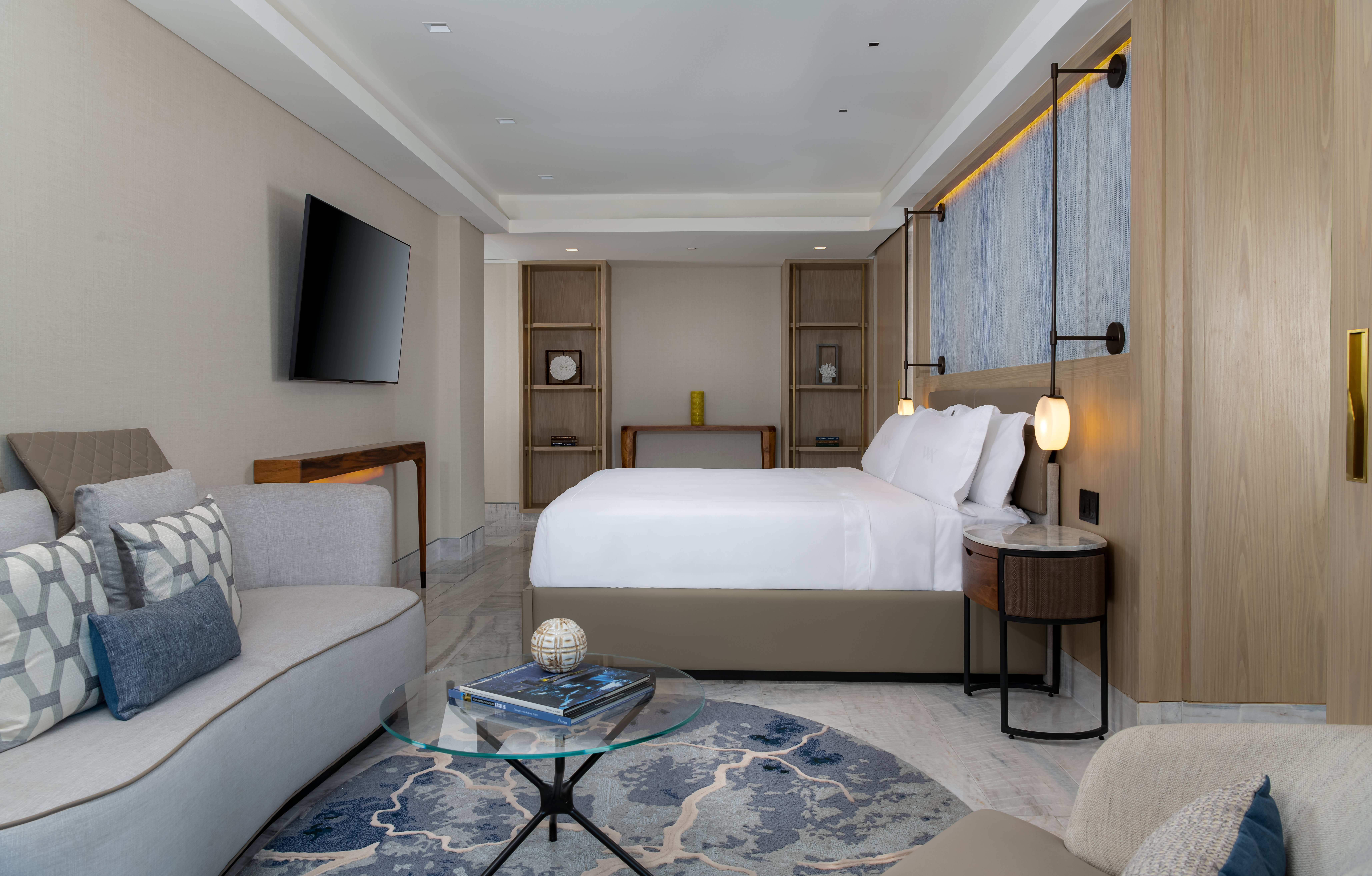 The most exclusive abode at Waldorf Astoria Riviera Maya is the Ocean Front Two-bedroom Presidential Suite. Floor-to-ceiling windows throughout ensure the stunning beachside setting takes center stage.