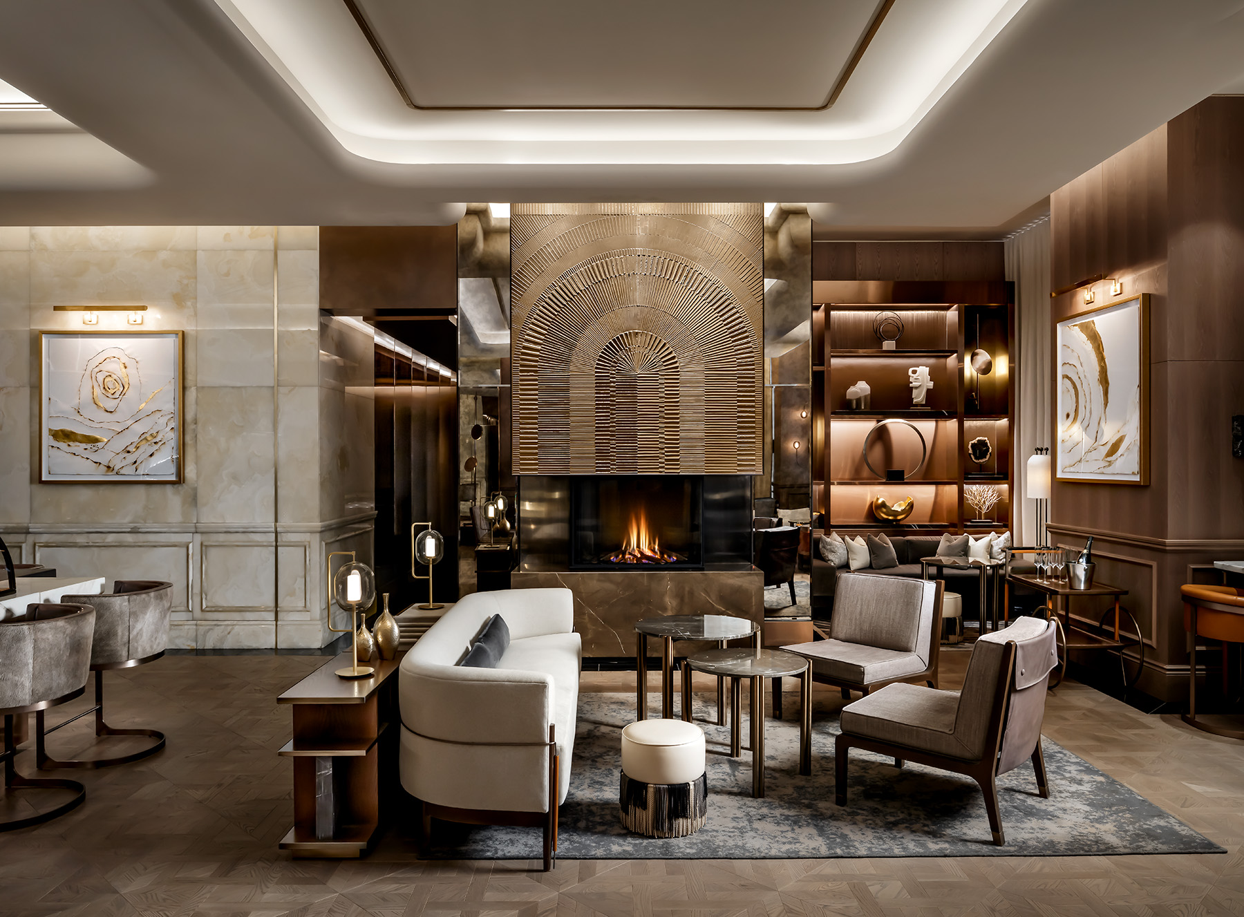 The John Jacob Astor Suite is named in homage to the legendary founder of the St. Regis brand—a titan of New York society and a visionary of early American luxury. His legacy lives on in this two-bedroom residence, designed for both comfort and occasion. The open-plan living and dining area is framed by floor-to-ceiling windows and centered around a marble-flanked fireplace, with sculptural lighting above a dining table for ten. Bold accents of crimson velvet, dark wood and polished metal contrast a neutral base, creating a space that feels both composed and expressive. A full kitchen and pantry, accessible through a discreet service corridor, support private dining or entertaining. The primary bedroom invites quiet retreat, featuring a tufted leather headboard, silk drapery, and a generous walk-in closet. Its en suite bathroom includes glossy black vanities, veined marble flooring, and a freestanding soaking tub set before floor-to-ceiling windows beneath a crystal chandelier. A second bedroom, equally refined, offers its own marble-clad bath and ample wardrobe space - designed with guests in mind, and finished to the same exacting standard.