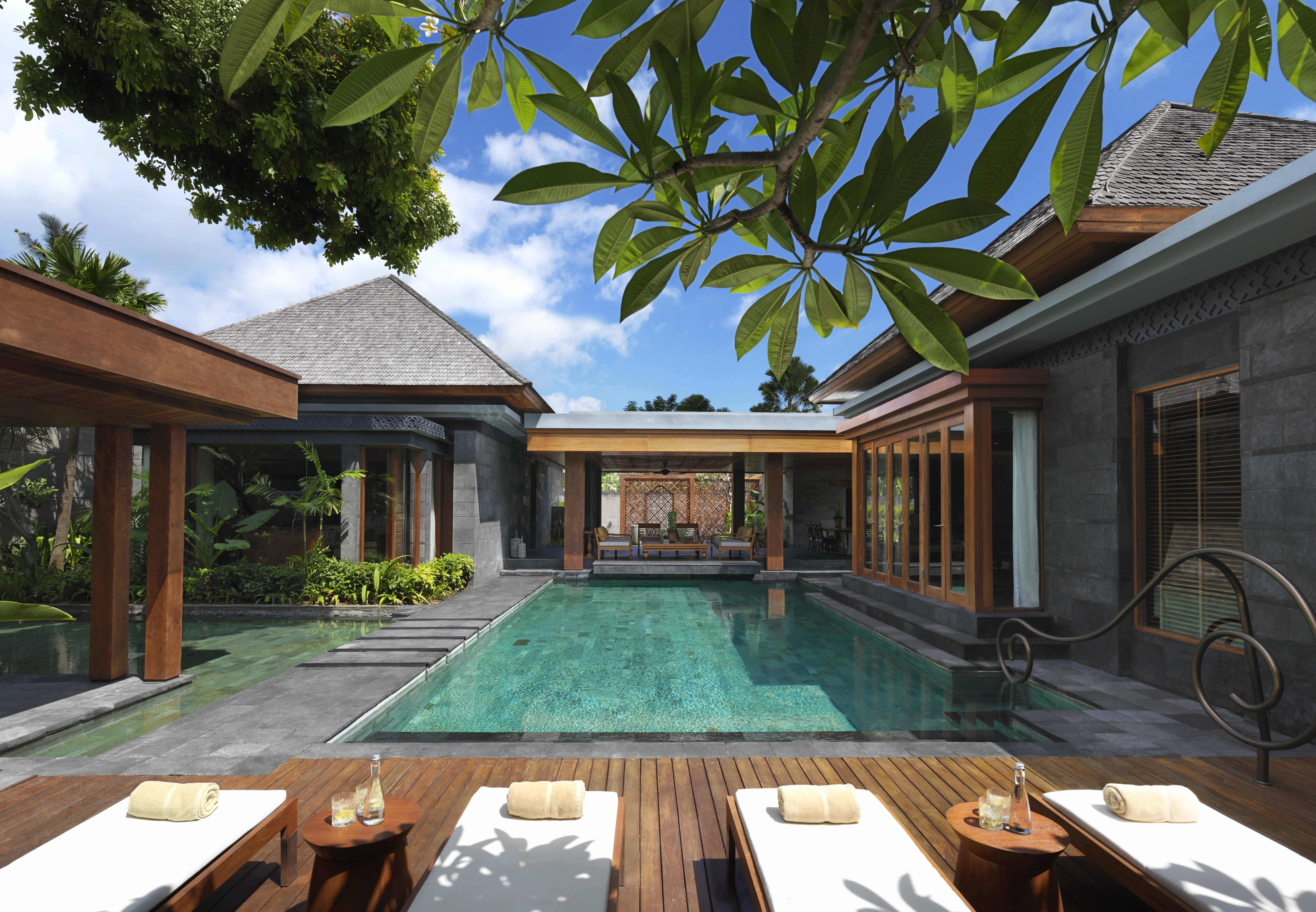 The master bedroom is set up for comfort, including a separate boudoir for dressing, a large walk-in closet, and an outdoor shower framed by tropical foliage. For a true moment of calm, the oversized sunken marble tub sits behind wooden doors that open directly onto the jungle greenery, providing a tranquil, immersive soak. All living rooms and bedrooms orient toward the central sunken swimming pool and daybed. This area is bordered by a wooden deck and multiple loungers, setting the stage for lazy afternoons in the sun.