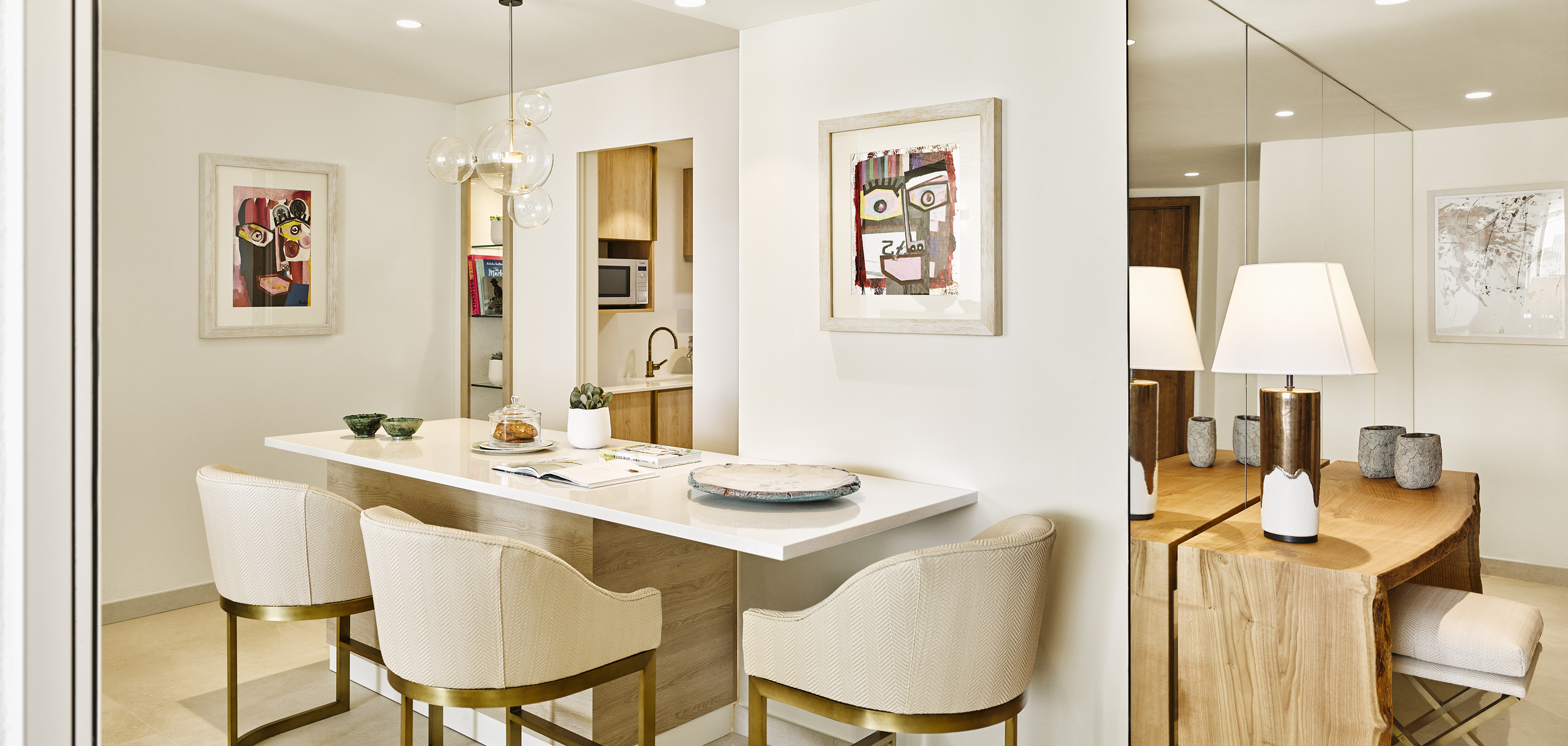 The Nobu Penthouse Suite sits above Talamanca Bay, offering a direct line of sight to Ibiza Town. This is where Nobu's signature minimalism meets the island's relaxed sophistication. Entering the suite, the luminous living space is anchored by artisan leather rugs, hand-blown pendant lights, and bronzed accents. The open-plan living and dining area, featuring a bespoke bar and sleek kitchenette, creates a refined residential setting. This configuration is ideal for enjoying Nobu Matsuhisa's exclusive in-room dining privately.